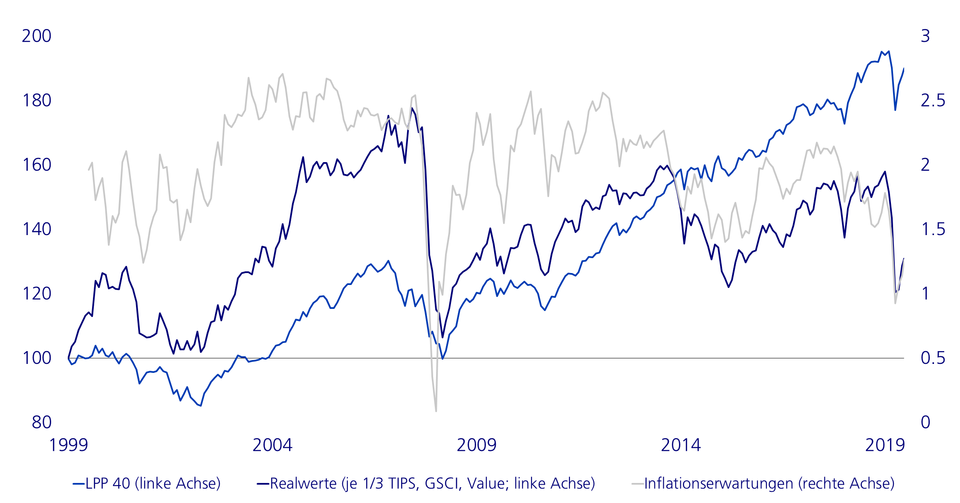 Soll man nun also ausschliesslich in Realwerte investieren? Um dies zu prüfen, bilden wir einen gleichgewichteten Realwerte-Basket, bestehend aus US TIPS (in CHF abgesichert), dem MSCI Value und dem GSCI Rohstoff Index. Wie Chart x zeigt, ist dieser Basket auch tatsächlich sehr stark mit den Inflationserwartungen korreliert. Im Vergleich dazu scheint ein klassisches gemischtes Portfolio (LPP 40) relativ unabhängig von Inflationserwartungen zu sein. Da der Realwerte-Basket aber deutlich volatiler ist, ist langfristig die Sharpe-Ratio (Kennzahl, welche die Überrendite über dem risikolosen Zinssatz pro Risikoeinheit misst) markant schlechter (0.18 vs. 0.53). Zudem sind die Drawdowns gewaltig.