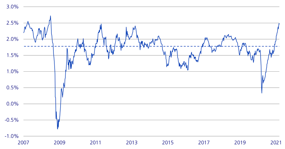 Aufgrund der stark anziehenden Rohstoffpreise und deutlichen Engpässen in diversen Lieferketten haben die aufkommenden Inflationsängste unsere Erwartungen inzwischen sogar übertroffen. Die Inflationsrate wird in den USA aufgrund von Basiseffekten im Mai gegenüber dem gleichen Vorjahresmonat zwar auf über 3 % ansteigen, damit sollte hier aber ein vorläufiger Höhepunkt erreicht sein. In Erwartung dieser Entwicklung haben wir bei unseren taktischen Positionen nun bereits graduell Gewinne realisiert.