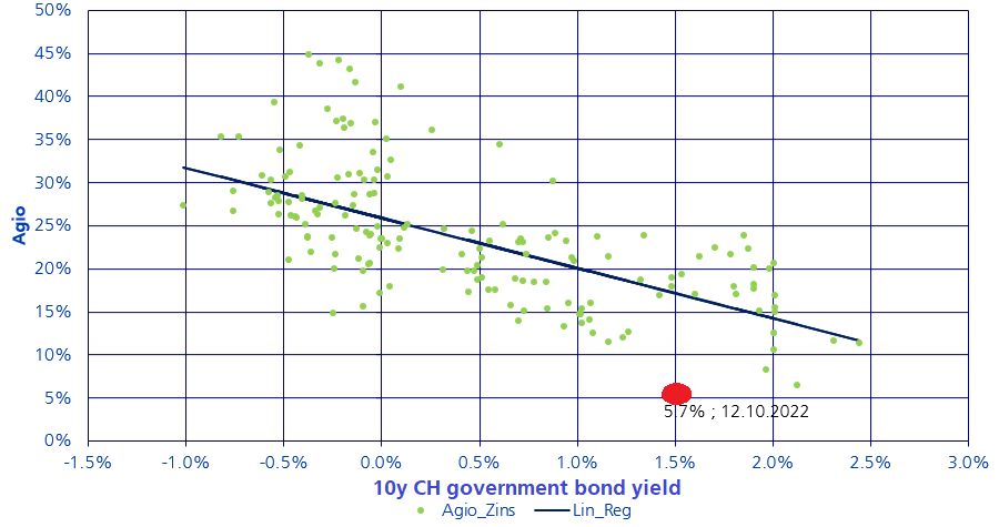 An den Börsen werden die künftigen Erwartungen gehandelt: Insofern nimmt die Börse gewisse Entwicklungen am Immobilienmarkt bereits vorweg. Betrachtet man historisch das Verhältnis der durchschnittlichen Agios und der langfristigen Zinsen so fällt auf, dass beim aktuellen Zinsniveau (10-jährige Eidgenossenrendite: 1.5%) in der Vergangenheit ein höheres Agio gehandelt wurde. Oder anders gesagt, beim aktuellen durchschnittlichen Agio (5.7%) müsste historisch betrachtet ein deutlich höheres Zinsniveau vorherrschen. Allfällige Abwertungen der Immobilien würden dieses Verhältnis relativieren, denn das Agio würde bei gleichbleibenden Börsenkursen und tieferen Immobilienwerten automatisch ansteigen. Laut unseren Informationen ist der Transaktionsmarkt jedoch weiterhin liquide und die bezahlten Preise sind nach wie vor hoch. Kurzfristig deutet dies auf keine grossflächigen Abwertungen im Immobiliensegment hin. Wir gehen heute davon aus, dass sich der Transaktionsmarkt leicht abkühlen wird.