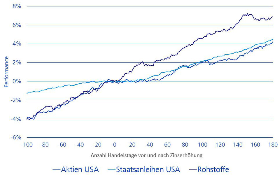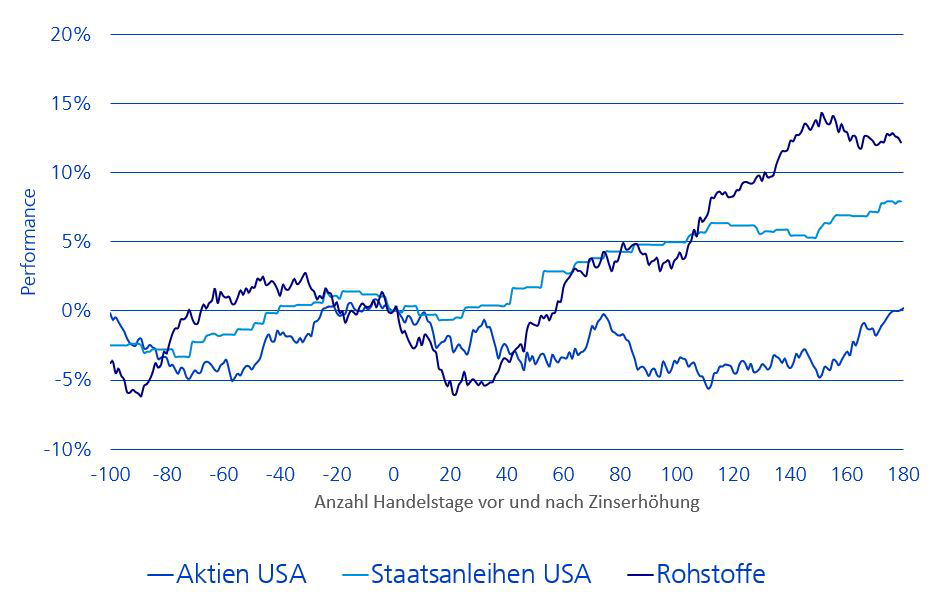 Aus der Grafik geht hervor: Die gängige Befürchtung, Zinserhöhungen würden Aktienmärkte nach unten drücken, hat sich in der Vergangenheit nicht bewahrheitet. In der Tendenz stiegen die Aktienmärkte vor einer Zinserhöhung und bewegten sich danach eine Zeitlang seitwärts, bevor sie ihren Anstieg weiterführten. Dasselbe gilt auch für Anleihen. Bei Rohstoffen war die Performance nach einer Zinserhöhung im Durchschnitt am besten.