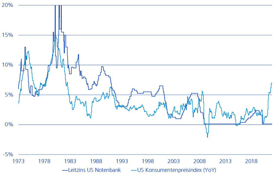 Ab den 2000er Jahren war die Inflation sehr tief. In den USA betrug sie im Schnitt rund 2.2%. Das erlaubte den Notenbanken, eine viel expansivere Geldpolitik zu führen als in vorangegangenen Jahren. Die eingangs erwähnte unerwartet lebhafte Renaissance der Inflation erwischte die Notenbanken denn auch auf dem falschen Fuss. Noch nie seit 1973 war die Differenz zwischen dem US-Konsumentenpreis-Index (CPI) und dem angepeilten Leitzins der Fed so gross wie heute, wie die nachfolgende Grafik zeigt.