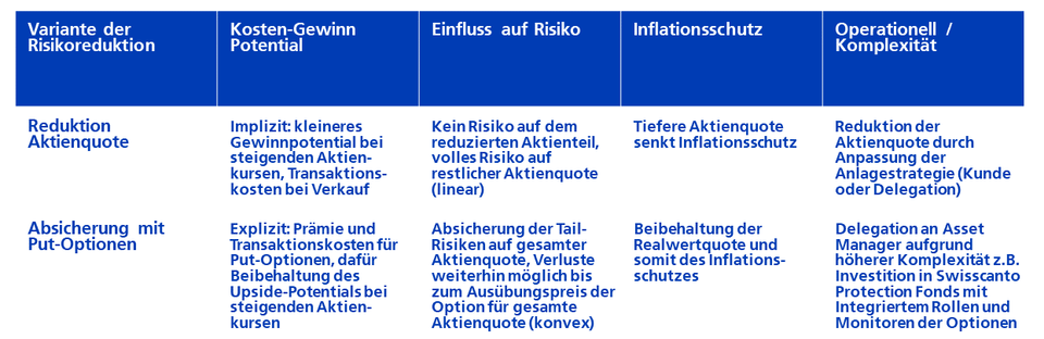 Welche Form der Risikoreduktion für Anlegerinnen und Anleger am besten passt, hängt von deren individuellen Präferenzen ab. Die folgende Tabelle beschreibt Vor- und Nachteile der genannten Risikoreduktions-Varianten:
