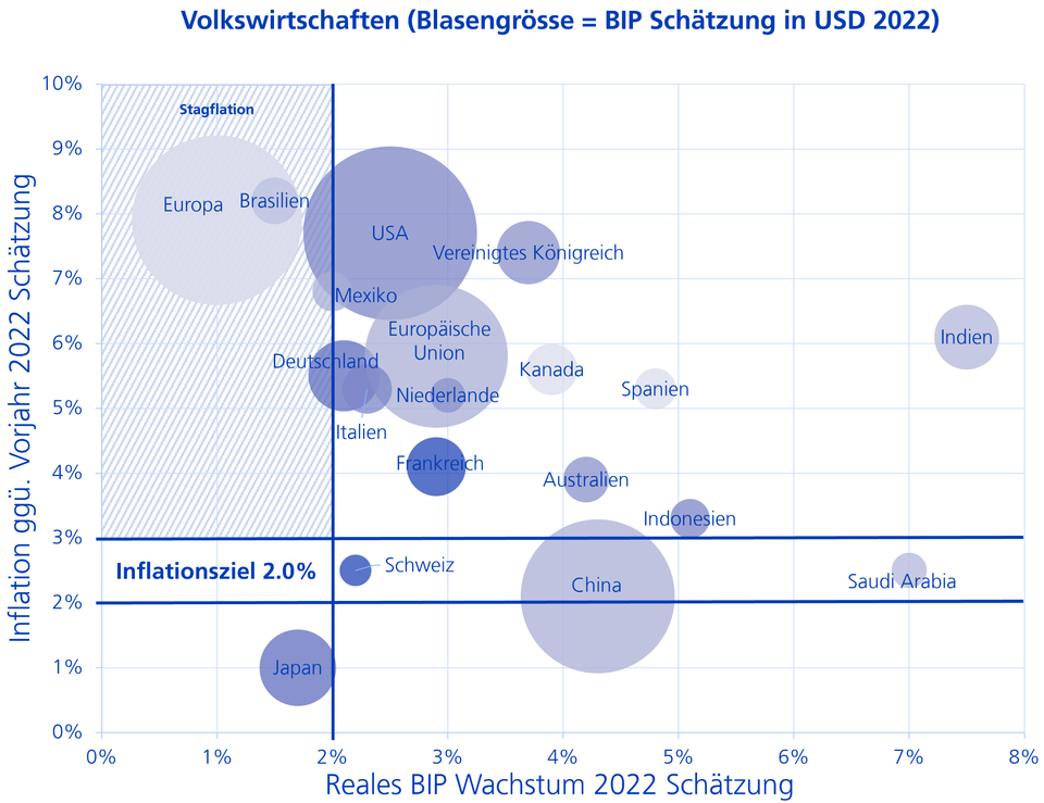 Viele Volkswirtschaften sind schon an der Schwelle zur Stagflation. Die nachfolgende Grafik zeigt, wie wir die 20 grössten Volkswirtschaften in Bezug auf Stagflationsgefahr einschätzen. Dazu wurde ein «Stagflationskorridor» ermittelt. Dieser beginnt bei einem realen BIP-Wachstum von weniger als 2.0 % bei gleichzeitiger Inflation gegenüber dem Vorjahr von höher 3.0 % (blau schraffierte Fläche). Demnach besteht für Europa als Ganzes und Brasilien schon Stagflationsgefahr. Knapp davor befinden sich Mexiko, Deutschland, Italien und die USA.