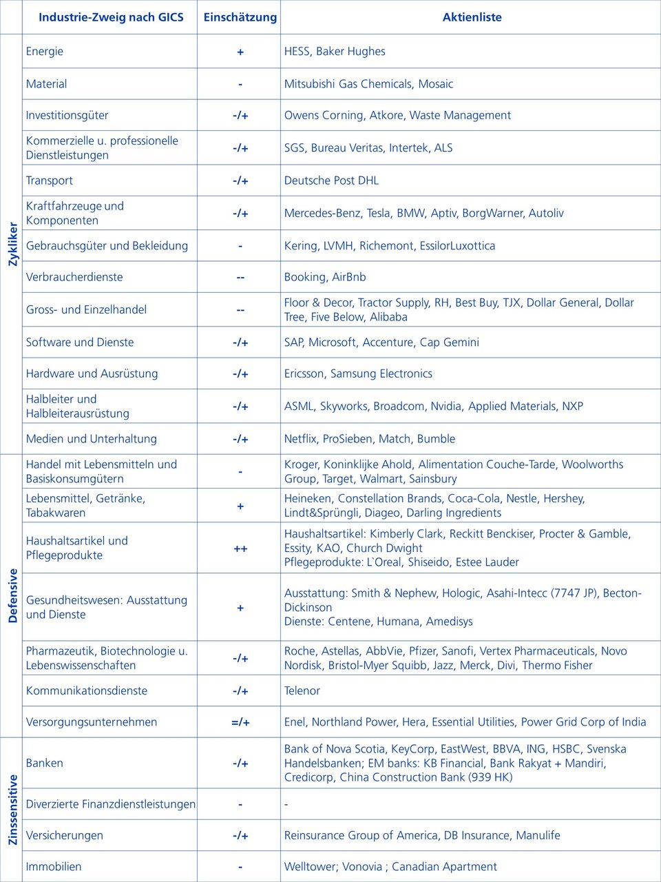 Im Bereich der zyklischen Werte kann, global betrachtet, nur der Energie-Sektor Vorteile aus einem Stagflationsumfeld ziehen. Gründe hierbei sind die starke Nachfrage und das geringe Angebot auf der Energieseite. Eher fündig werden Investoren im Bereich der defensiven Werte. Hier insbesondere die Sektoren Haushaltsartikel und Pflegeprodukte, Lebensmittel und Getränke sowie das Gesundheitswesen (Ausstattung und Dienste). Diese Sektoren bieten verstärkt Produkte an, welche unabhängig von der wirtschaftlichen Lage immer nachgefragt werden. Im Bereich der zinssensitiven Werte, z.B. Banken und Versicherungen, ist das Bild eher gemischt. Zwar profitieren Banken von einem Anstieg der Zinsen, allerdings besteht auch eine hohe Sensitivität gegenüber dem Finanzmarkt.