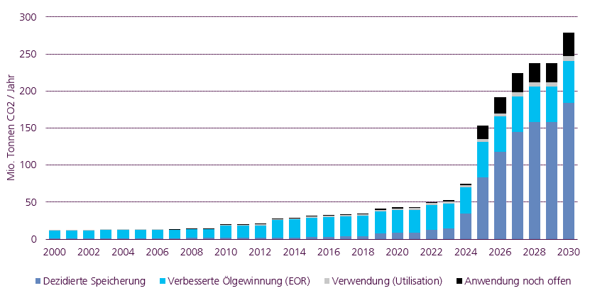 Das Marktforschungsunternehmen Bloomberg New Energy Finance (BNEF) hat alle CCUS-Projekte evaluiert und errechnete eine weltweite CCUS-Kapazität bis 2030 von 279 Megatonnen pro Jahr. Im Jahr 2021 standen wir bei 44 Megatonnen. Das entspricht einem kumulierten jährlichen Wachstum von 20 %.