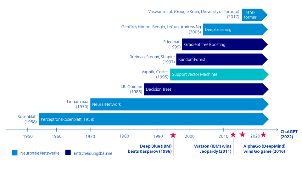 Die konkrete Umsetzung der KI begann in den 1950er Jahren mit der Erfindung einer einzelnen Zelle (Perceptron) und der Entdeckung des neuronalen Netzes in den 1970er Jahren. Diesen Netzwerken blieb jedoch der grosse Durchbruch verwehrt, da die Computer damals zu wenig Rechenleistung hatten und die Datensätze zu klein waren, um die Algorithmen effizient zu trainieren. In den 1980er und 1990er Jahren wurden Entscheidungsbäume populär. Da ein einzelner Entscheidungsbaum zwar transparent, die Vorhersagekraft aber gering ist, werden bei Random Forest- und Boosting-Algorithmen verschiedene Entscheidungsbäume miteinander kombiniert, was die Prognosen deutlich verbessert.
