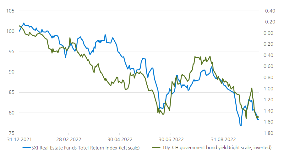 In the course of the slight decline in longer-term interest rates from the end of June to mid-August of this year, stock market prices and also the premiums of listed Swiss real estate funds recovered somewhat. However, longer-term interest rates have risen again since mid-August due to persistently high inflationary pressure. To counteract the high inflation, the Swiss National Bank raised the key interest rate to 0.5% in September. As a result, the prices and premiums of listed real estate funds came under severe pressure once again.