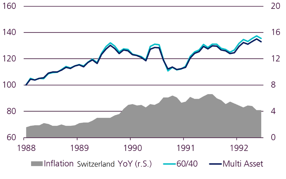 | After Black Monday in 1987, when the Dow Jones collapsed by almost 23% within one day, interest rate hikes also combated the sharp rise in inflation (from 1% to 6% in the USA and Switzerland). In contrast to the 70s, however, inflation did not get out of hand; interest rates were higher at the beginning of monetary tightening than they are today. Tightening therefore remained moderate and growth robust. In the subsequent recession, in the early 90s, central banks cut interest rates early on. The resulting positive yield on bonds limited the drawdown of the 60/40 portfolio to -15.2%. Here too, the losses in the multi-asset portfolio were somewhat smaller thanks to the real assets. |
