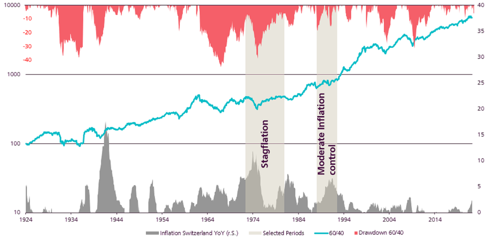 High inflation brings rising interest rates – with equities and bonds going down together. How does a mixed Swiss portfolio behave during phases like this? Since we have not experienced such high inflation for a long time, an analysis of historical inflation phases may provide clarity and suggest courses of action. We have examined a mixed Swiss portfolio spanning a period of 100 years.