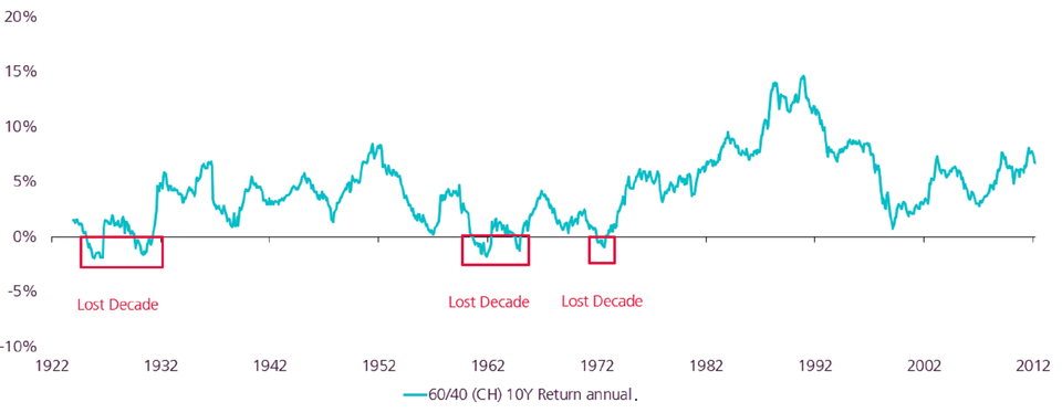 Figure 4: Rolling 10-year nominal return (annualized) of the Swiss 60/40 portfolio in %.
