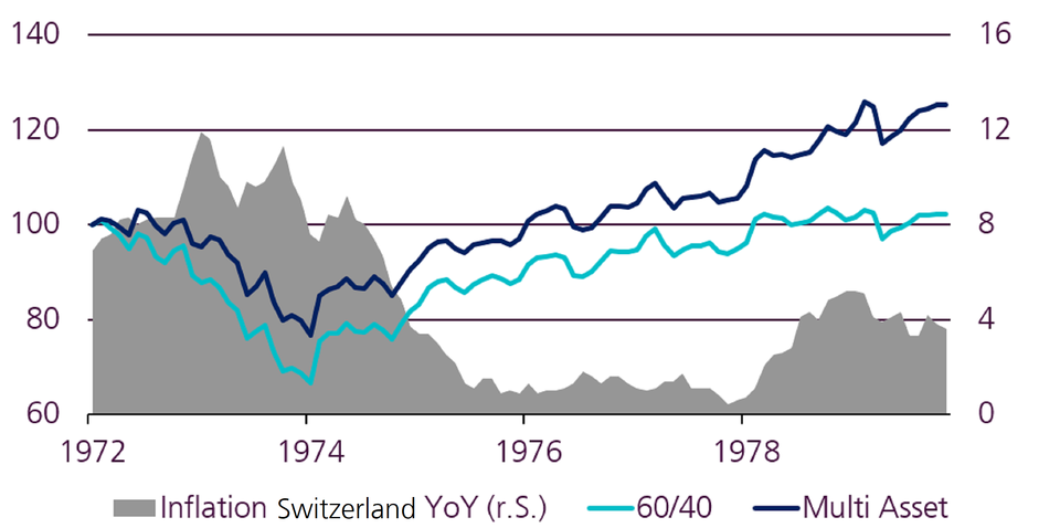 Figure 1 shows that in Switzerland, inflation (the grey area) was particularly pronounced at up to 15% during the Second World War. In peaceful times, two phases are especially striking: the 70s and 80s. The value of a mixed portfolio (turquoise line) has not always risen over the last 100 years, as one might think at first glance. Maximum losses (drawdown: red area) of almost 40% were recorded in the mid-60s and 70s. We are focusing on the two (marked) periods in the 70s and late 80s. These phases are characterised by sharply rising inflation rates – as we are also currently experiencing. Can response patterns and courses of action be derived from this basis?