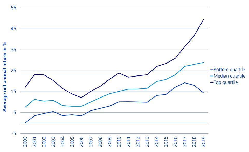 Nonetheless, there are major differences in the implementation of the investment strategy among the respective private equity managers. This leads to a wide range of performance results. In 2019, the return difference between the best and worst private equity funds was around 35 percentage points. For this reason, the selection of and access to the best fund managers is crucial for investors to successfully invest in private equity.