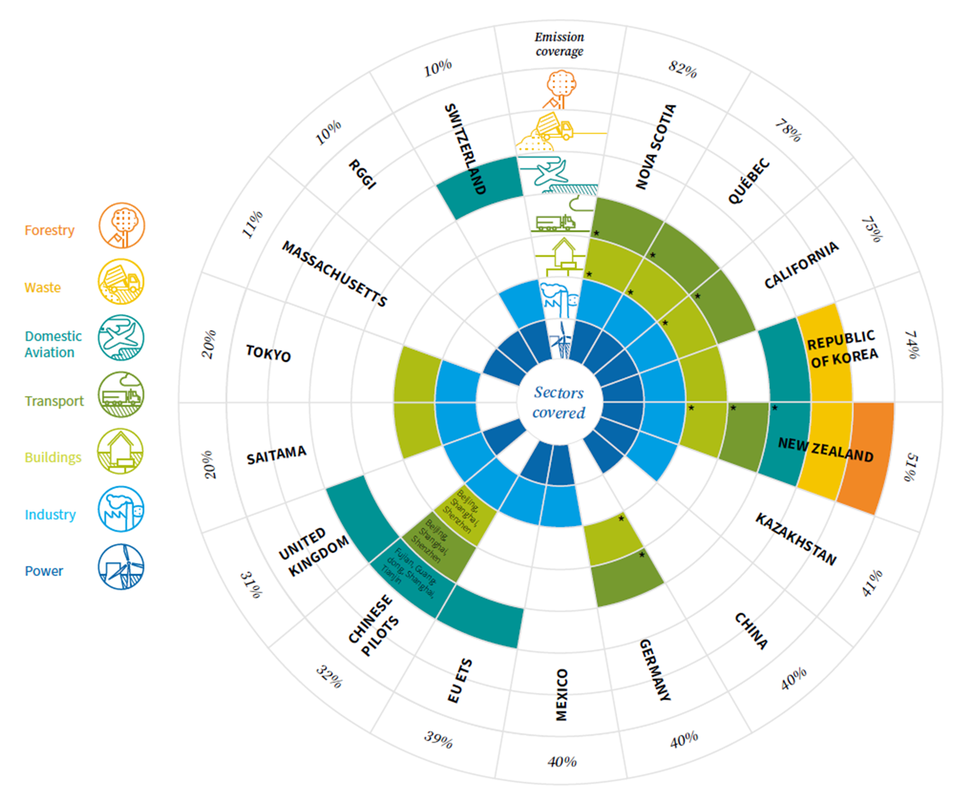 - California, whose ETS covers 75% of regional CO2 emissions and comprises the electricity, industry, buildings and transport sectors