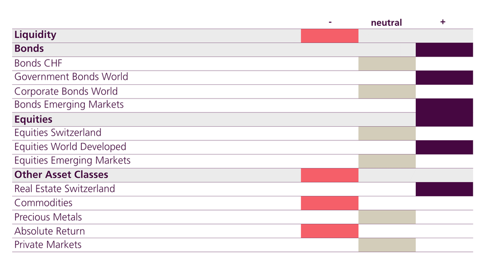 Our asset allocation for the coming year consistently reflects our assertion of the return of the multi-asset portfolio. Consequently, we have overweighted bonds and equities at the expense of liquidity. In the case of bonds, we favor global government bonds and bonds from emerging countries. On the equity side, we see opportunities in developed markets in particular. We hold a positive view of Swiss real estate.