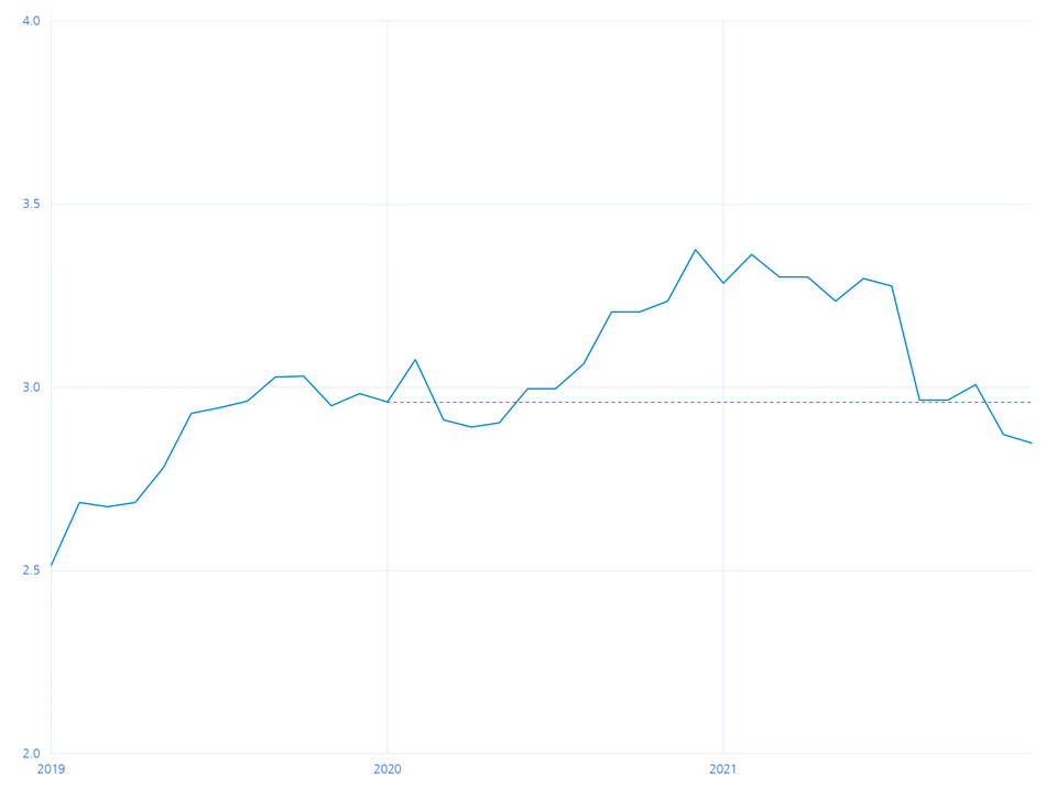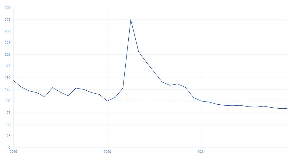 Noch stärker gesunken ist im gleichen Zeitraum der Netto-Verschuldungsgrad. Bei dieser Kennzahl wird der Schuldenstand einer Unternehmung um die liquiden Mittel reduziert und dann ins Verhältnis zum Gewinn vor Zinsen, Steuern und Abschreibungen gesetzt. Der Netto-Verschuldungsgrad lag Anfang 2020 bei 3.0x, stieg im Zuge der Pandemie bis auf 3.4x und ist seither auf 2.8x gesunken, also unter das Vorkrisenniveau. Grund für den starken Rückgang sind deutlich gestiegene Unternehmensgewinne, die nur teilweise an die Aktionäre ausgeschüttet wurden und somit in Form von liquiden Mitteln auf der Bilanz verbleiben.
