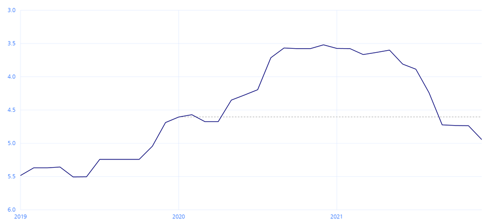 Auch die dritte wichtige Kennzahl, der Zinsdeckungsgrad, hat sich seit dem Ausbruch der Pandemie stark verbessert. Beim Zinsdeckungsgrad wird der Gewinn vor Zinsen und Steuern zu den Zinsaufwendungen ins Verhältnis gesetzt. So lässt sich abschätzen, wie viel des Gewinns ein Unternehmen aufwenden muss, um die Zinszahlungen auf seinen Verpflichtungen zu bedienen. Der Zinsdeckungsgrad sank ab Anfang 2020 innerhalb eines Jahres von 4.6x auf 3.6x und ist seither wieder auf starke 4.9x angestiegen.