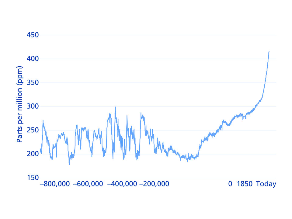 Since industrialisation and the almost unstoppable combustion of fossil fuels, more and more greenhouse gases such as carbon dioxide (CO2) have become concentrated in the atmosphere (see chart below). With far-reaching consequences: meanwhile, the global climate is 1.3°C above the pre-industrial average; extreme weather events are just one indication of this development. Anthropogenic global warming now needs to be counteracted with a rapid reduction in CO2 emissions. According to the ambition of politics and the economy, no more greenhouse gases may be emitted into the atmosphere worldwide by 2050 than can be extracted by natural or technical means. This would achieve the net zero target.