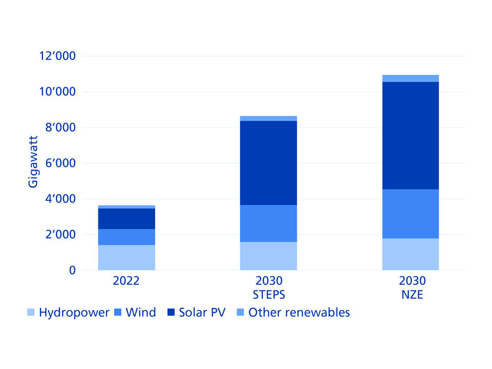 This creates corresponding economic potential. For example, the International Energy Agency estimates that from 2030, depending on the scenario, decarbonisation could result in annual investments of between USD 2.3 trillion and USD 4.5 trillion. The effective solutions for coping with climate change are numerous and the technology has in many cases already been established. In the analysis they are divided into four fields: renewable energies such as solar and wind power (see chart below), as well as the energy efficiency achieved with heat pumps, for example. In addition, there is the transition to sustainable mobility, which can be achieved with electric vehicles and public transport, for example. Finally, the area of resource efficiency is important, such as with the transition to a circular economy. These four fields correspond to the main investment areas we have identified for investors.