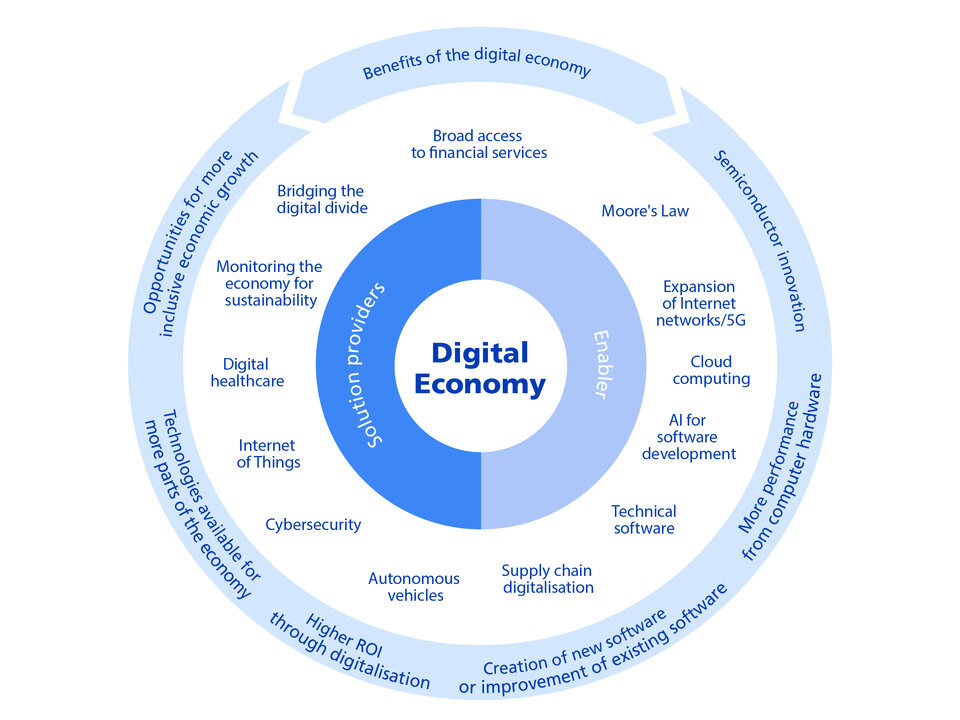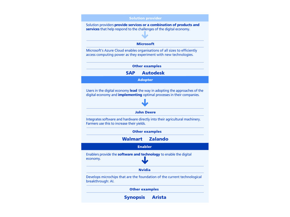 The digital economy is closely linked to digitalisation, a long-term investment theme. According to our analysis, there are still considerable opportunities to increase the use of technology in the economy and society as a whole. The "digital economy" offers investors a wide range of investment opportunities. We focus on the areas of digital infrastructure and access, security, environmental protection and the empowerment of people. At the heart of this approach are the pioneering solution providers, as well as companies that use such solutions in their processes, plus the enablers (adopters). The latter provide software and technologies to support the digital economy.