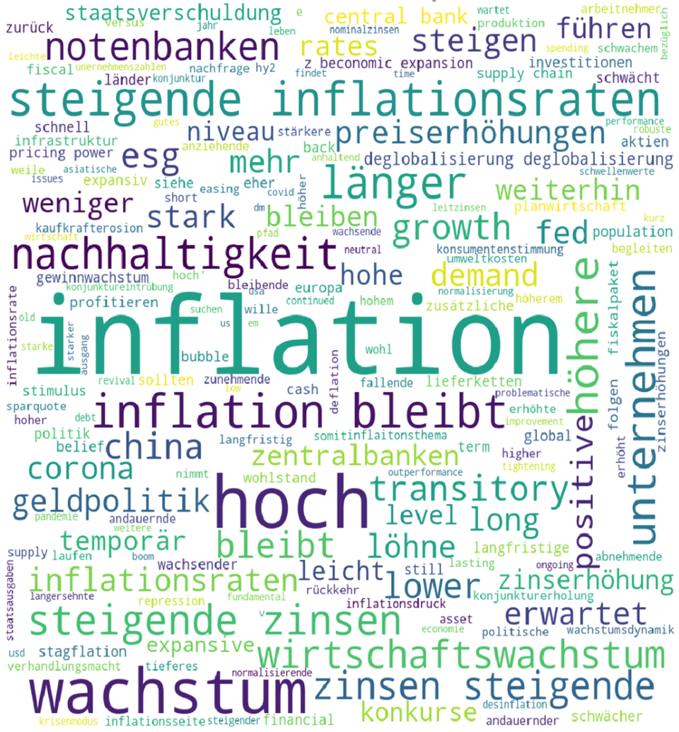 In the survey, we ask about the medium-term drivers of the market, the potential risks with their probability of occurrence, the optimal investment positioning and the most attractive investment themes. We use word clouds and classifications to visualise the inputs. An example of a word cloud for the most important drivers for 2022 is shown in the following graphic (only in German). It is based on expert input on key points for 2022.