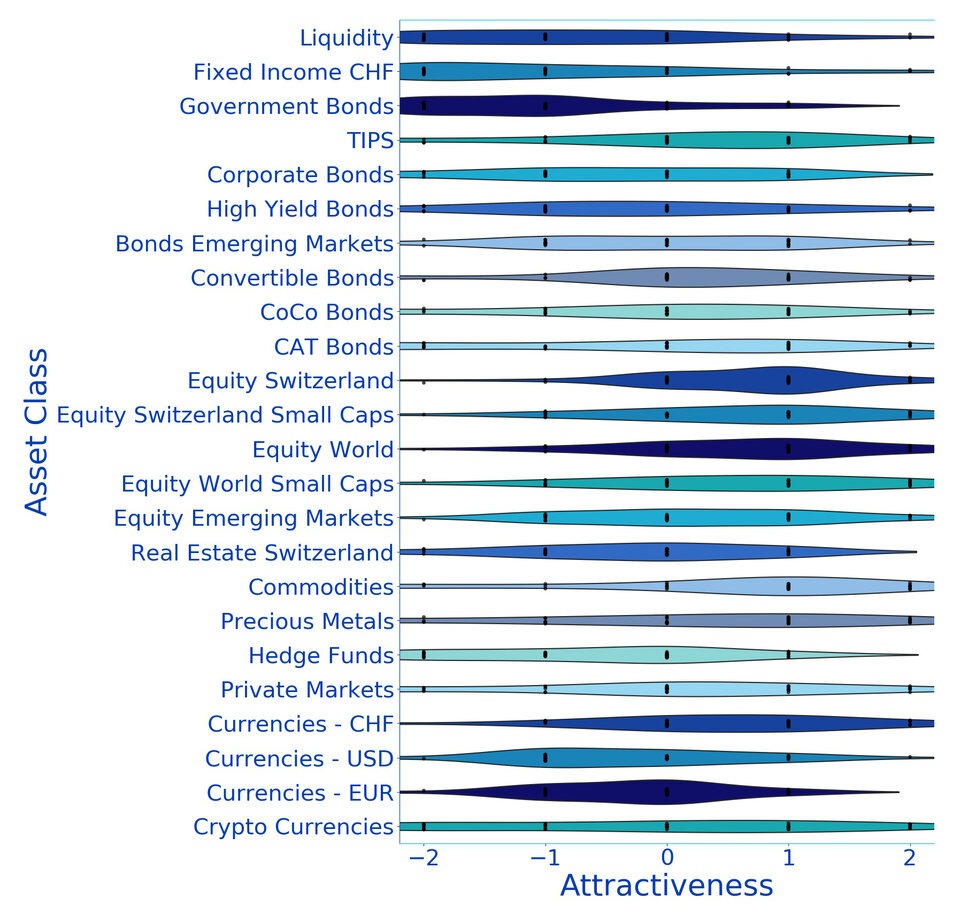 The positioning seen as optimal by our portfolio managers for the coming year provides important input on future expectations. For example, as it turned out for the first quarter of 2022, rising interest rates and higher commodity prices were correctly forecast by the majority. The positionings for each asset class are aggregated and represented graphically for the multi-asset committee.