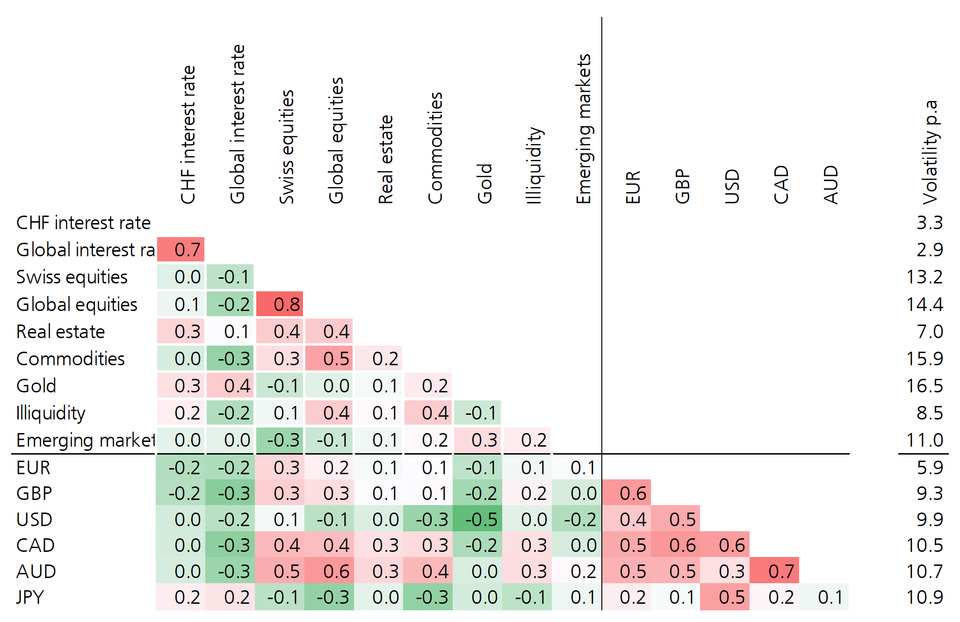 For the interaction of the risk factors, we show the correlation matrix we currently expect with the expected risk (volatility p.a.). Thanks to the heterogeneous selection of the fundamental factors, the correlations between the factors are low, which ensures the stability of the risk model. Only the Swiss franc, the global interest rate factor and Swiss and global equities measured in local currency are expected to be highly correlated. However, since these factors form an important part of a typical Swiss investment strategy, they are incorporated directly into our risk model.