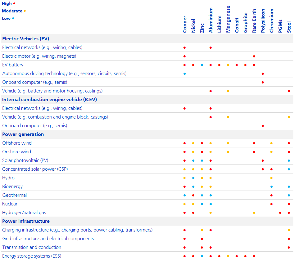 The use of materials is multi-faceted and will be increasingly driven by energy technologies in the future (see Figure 3). For example, nickel, together with copper and aluminium, is widely used in electric vehicles, power generation and energy infrastructure. Lithium and cobalt, on the other hand, are primarily used in batteries.