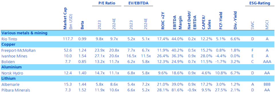In our active, fundamental equity strategies, we pay particular attention to developments in the commodities industry and consider critical raw materials to be essential for the energy transition. Nevertheless, it is important to note that commodity equities are subject to cyclical fluctuations, which in turn are influenced by various factors such as supply and demand, geopolitical events and macroeconomic trends. These cycles can present both opportunities and risks for investors alongside structural growth and are carefully monitored by us in order to make informed investment decisions. We currently recognise attractive sources of returns in commodities relevant to the energy transition, with quality characteristics (including stable earnings, strong balance sheets, high margins, low debt), attractive company valuations, strong returns on invested capital (ROIC) and a solid ESG risk profile at the heart of our stock selection. Accordingly, copper, aluminium and lithium are currently among our favourites.
